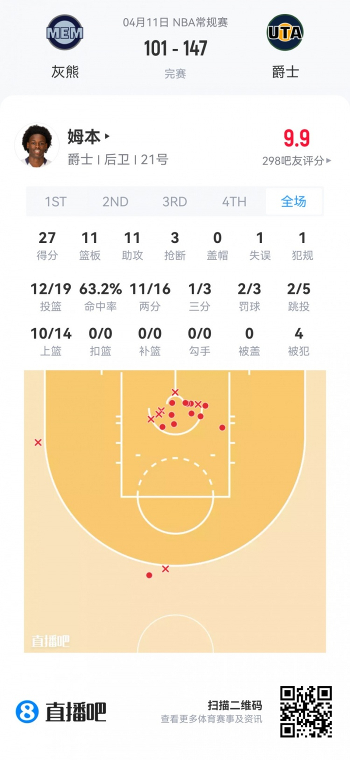 爵士落选秀姆本 登场38.2分钟