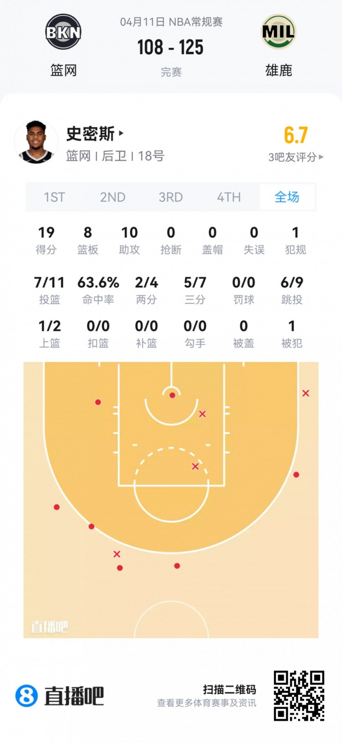 篮网落选秀马拉奇·史密斯 登场42分钟