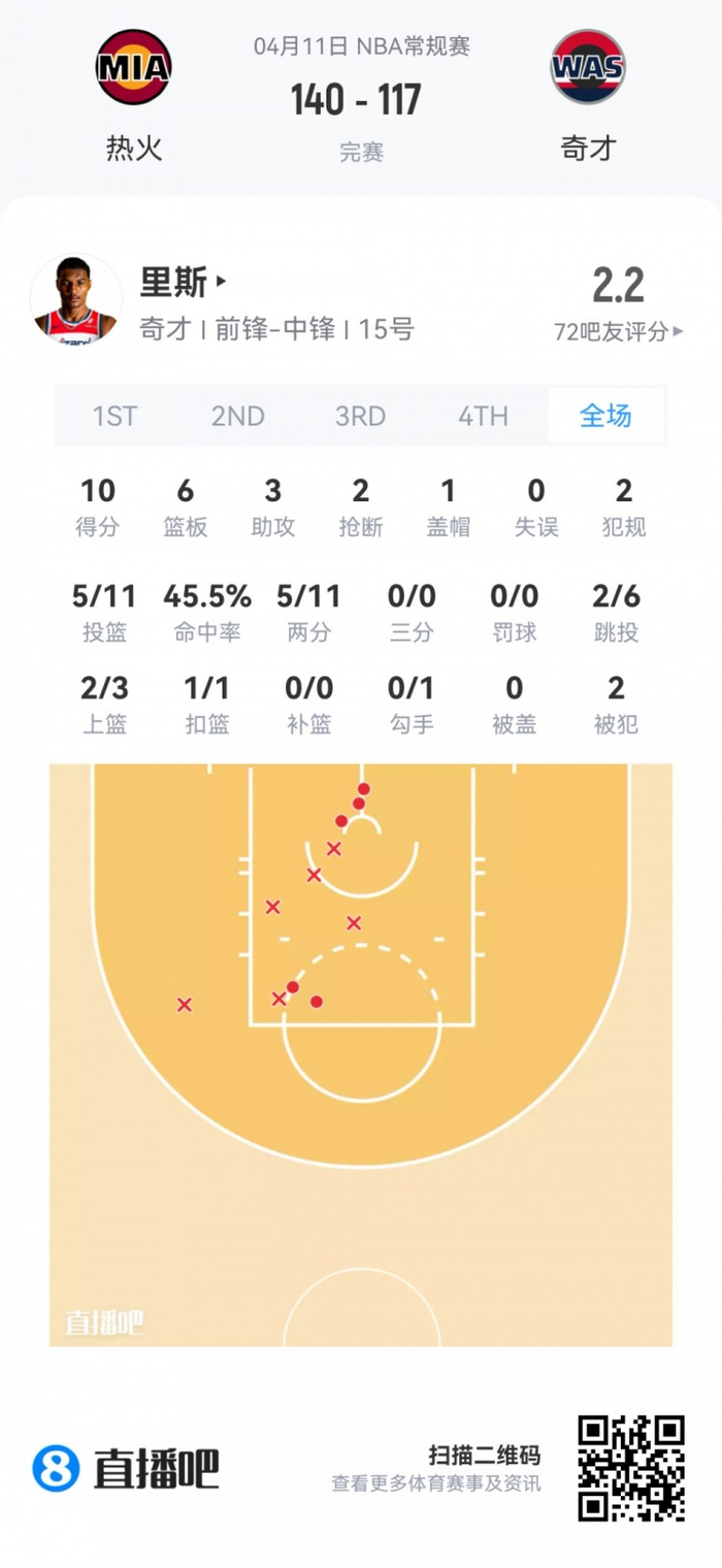 奇才落选秀朱利安·里斯 登场36.8分钟
