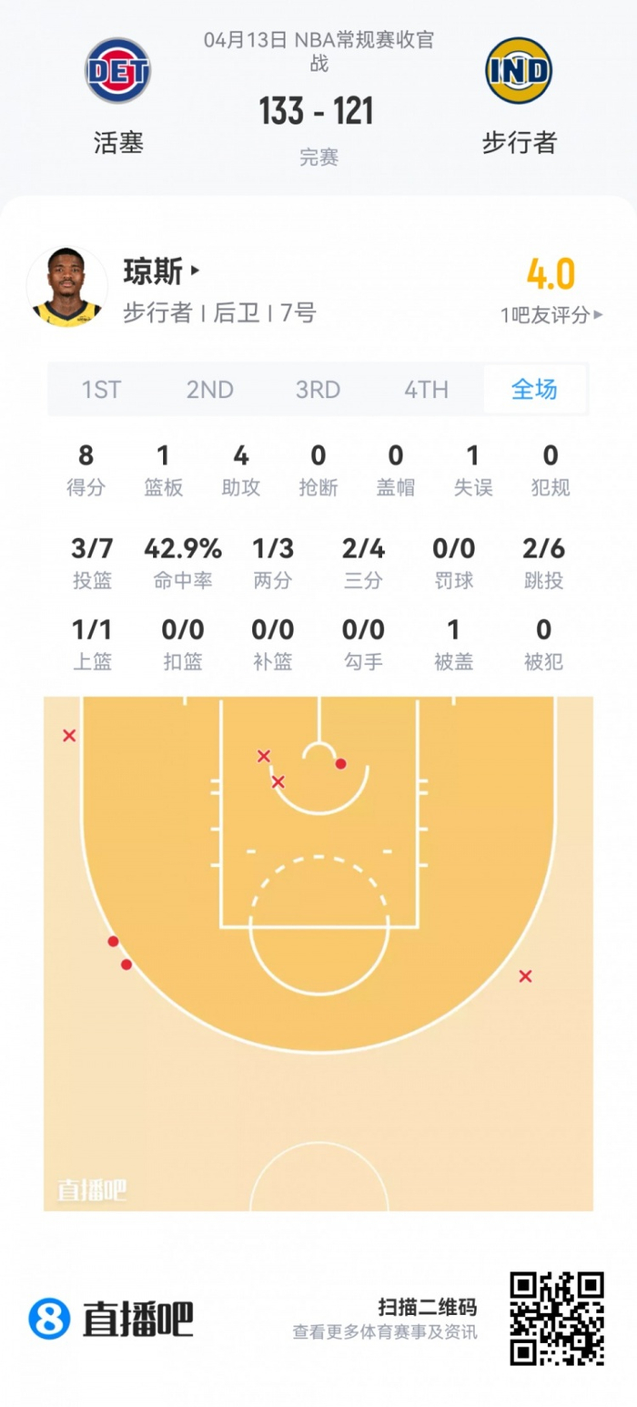 活塞次轮37号秀查兹·拉尼尔 登场5.9分钟