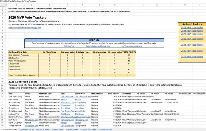 直播吧04月15日讯 跟踪每个赛季奖项投票的媒体人Max Croes,更新了本赛季至今已经公布的MVP选票统计(后续持续更新中)。