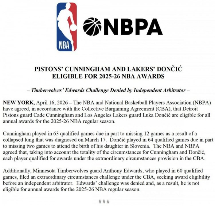 纽约,2026年4月16日讯——根据NBA劳资协议(CBA)相关条款,NBA与球员工会(NBPA)已达成一致:底特律活塞队后卫凯德·坎宁安、洛杉矶湖人队后卫卢卡·东契奇,具备2025-26赛季NBA常规赛所有年度奖项的评选资格。