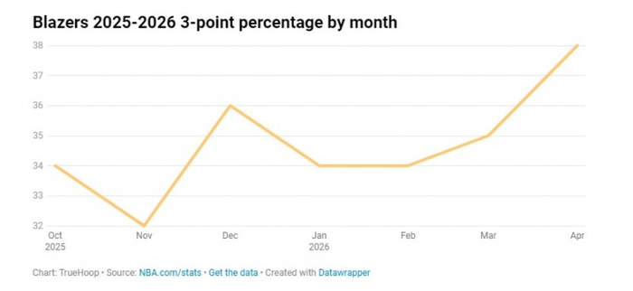 最近观看开拓者的比赛,似乎他们的三分球正在改善,这不是偶然现象。在篮球数据网站上,我发现开拓者在82场比赛中有17场三分命中率超过40%。他们在这些比赛中取得了14胜3负的成绩,很多胜利都是在赛季末取得的。这可能不是随机现象。