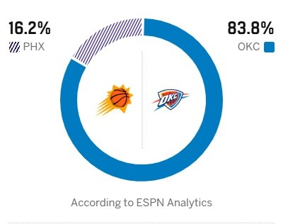 ESPN预测本场比赛胜率:雷霆83.8%,太阳16.2%。