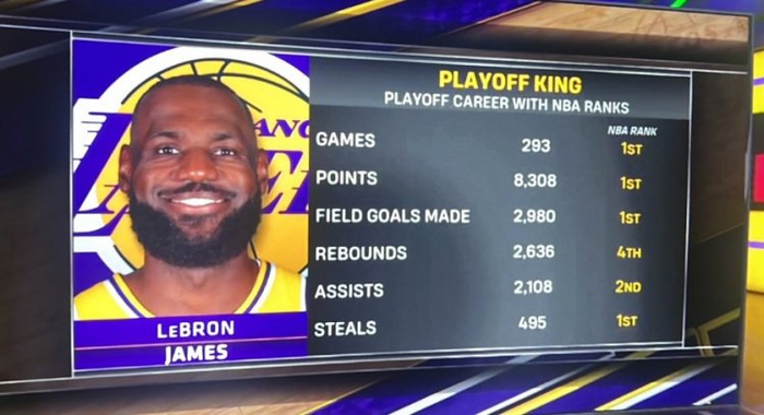詹姆斯季后赛出场数/总得分/命中数/抢断皆历史最多 助攻第二多