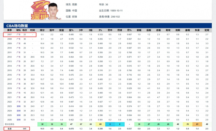 而在2007年2月25日,CBA季后赛首轮G2,广东客场对战上海,是役周鹏登场38秒,但是CBA官网同样没有将这场比赛计入周鹏当赛季的出场数统计中。