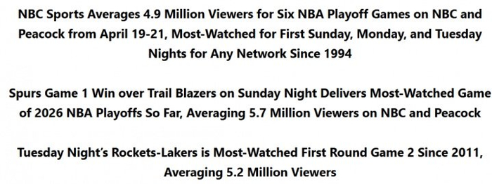 此外,开拓者VS马刺G1为本赛季季后赛目前为止收视最高的比赛——平均吸引570万观众。
