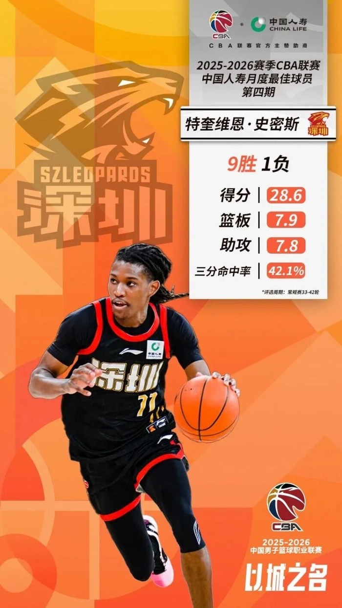 外援史密斯同期出战10轮赛事,带队斩获9场胜利,成为球队攻坚利器。他场均上场32分钟的时间里,能够得到28.6分7.9篮板7.8助攻,以42.1%的三分命中率场均命中4记三分球。在对阵新疆伊力特的比赛中,史密斯得到45分15篮板14助攻的大号三双数据,在对阵广州朗肽海本的常规赛收官战中,史密斯再次砍下三双(26分13篮板13助攻),帮助球队锁定常规赛第三,凭借出色表现,当选第四期中国人寿月度最佳国际球员。