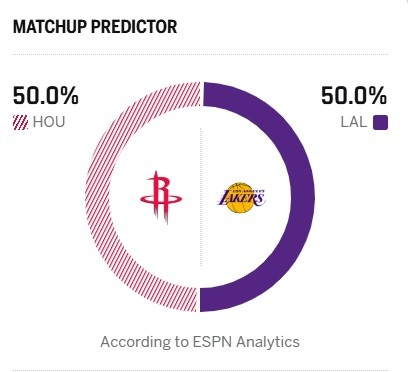 ESPN预测本场比赛胜率:湖人50%,火箭50%。