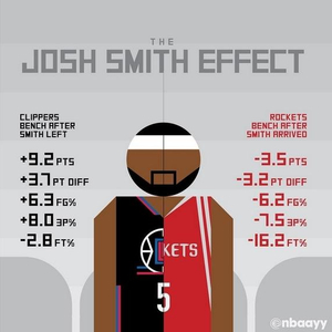 北京时间2月24日,约什-史密斯是一位让人又爱又恨的球员,虽然他的身手非常全面,但有时候会对本队造成杀伤。这点从他本赛季对快船和火箭这两支球队的板凳影响就能清楚地看出来。