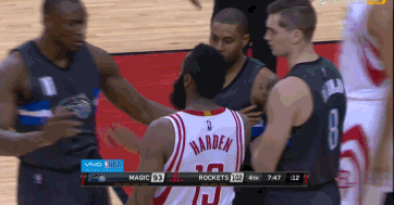 下半场戈登因故被雪藏,魔术在对哈登的防守上玩儿起车轮战,C.J。-沃特森、埃文-福尼耶和俾斯麦-比永博纷纷上阵,收到奇效。整个下半场哈登11投仅2中,还在第四节对沃特森防守时缠住自己手臂不满,并不理智地对赶来劝架的比永博发火,直到被前雷霆队友塞尔吉-伊巴卡拉开,才稍稍平静。