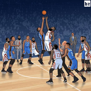 这张图展现的是比赛开始之前的跳球画面。但是我们注意到:站在中圈跳球的不是两队的中锋,而是詹姆斯-哈登和拉塞尔-威斯布鲁克这两名控卫。