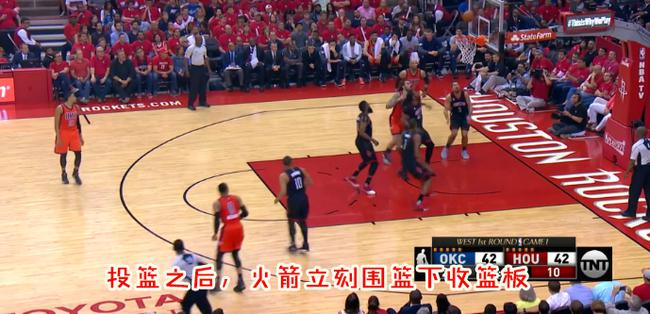 防守篮板跟防守策略有关,前文已经提到了,火箭对于雷霆的外线放的很大,这保证了他们的球员能够很快地回收篮下,而他们的内线大个又很少出去,能够在篮下提供及时的卡位。以一个回合为例: