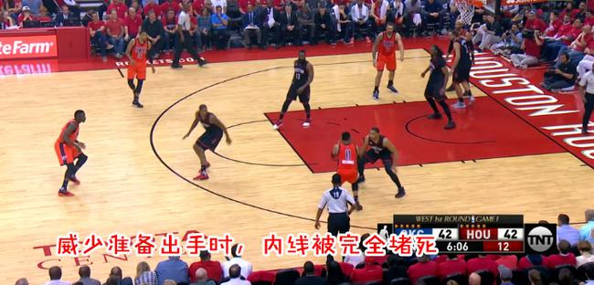 这个回合注意两个细节。先看内线,雷霆的三秒区是没有人站着协防的,再看雷霆球员的防守站位,所有球员都在进行人盯人防守,除去高位二打二的配合,其余火箭球员全部站在三分线外,雷霆的防线被扩的很大,这给持球人提供了非常广阔的进攻空间。