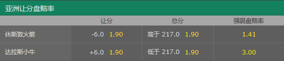 在逆转战胜迈阿密热火后,火箭主场迎来了一波三连胜。北京时间1月25日,火箭远赴达拉斯挑战独行侠队。从最新开出的赔率中看出,火箭客场让6分盘为近几场最深,赢球赔率为1赔1.41,赢球优势十分明显。