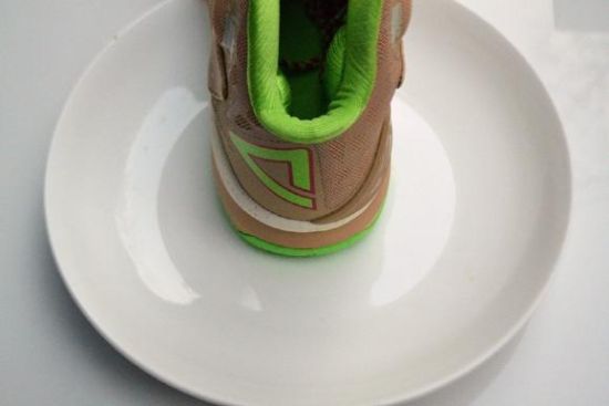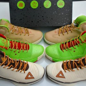 整个鞋面是饼干色,红绿相间的鞋带也是很有节日的氛围。脚后跟处的匹克LOGO可谓点睛之笔。而在底部,还有一个飓风的迷你图案。