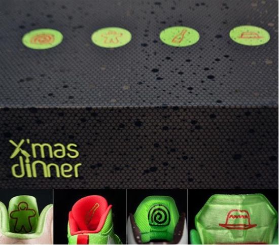 匹克精心烹饪的圣诞大餐,从鞋盒上就能看出诚意,四种美食的标识,红绿搭配。鞋盒两侧还有刀叉组成的X 形状,x′mas dinner。单从外观上来说,拿到鞋的第一反应会让人感觉到是收到了一分圣诞礼物,小细节暖人心。当你第一眼看到鞋盒图下方的四个图案,你有什么感觉?是不是会觉得很有节日的氛围?下面来一一为你带来详解。