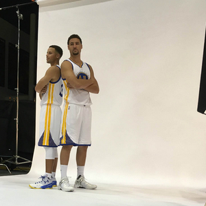 而他的好兄弟 克雷-汤普森则更像个淘气的大男孩。他拿着印着他名字和背号的白纸,站在蓝布前,配合着摄影师进行宣传照的拍摄。一组完毕后,摄影师让克雷放下(Drop:又译作 空投) 手上的纸,只见淘气的他两手一松,头一低看着纸一路飘到地上,像个还没长大的孩子。随后,转移场地,来到一块白布前,摄影师丢给克雷一个篮球,接到球的克雷就好似小朋友得到糖果一样,抑制不住的喜悦,开心的运起了球。见状,摄影师马上叫停,对着他说,“克雷,咱等会儿再运哈,现在先拍静态的。“ 听罢,克雷脸上掩饰不住的失落,嘴里喃喃道”好吧“ 便很不情愿的抱起了篮球,乖乖地继续配合摄影师的工作。