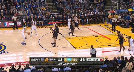 当库里跟格林发生挡拆时,布雷德索必须要追防,而防守格林的鲁埃尔必须过来跟防延阻库里,这个时候强侧底脚的塔克也要随时准备上提,而收在后面的钱德勒,他的目光也在库里和格林身上。一个挡拆,吸引了太阳四个人的防守注意力。这个球最终的结果,是库里拉出来错位打鲁埃尔,投中一个三分。而就在这个球的下一个回合,库里还是跟格林挡拆,而且是在同样的位置,只不过第二次库里是把球回给了格林,换格林投中了一个三分。