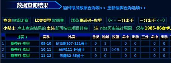 可能有球迷就会好奇了,库里职业生涯至今有多少场比赛出手三分但无一命中?答案是:31场。