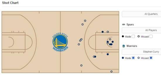 在这31场三分有出手无命中的比赛中,库里三分出手最多的一场便是前文提到的对阵马刺那场。这么说来的话,马刺倒真有点儿库里苦主的意思。