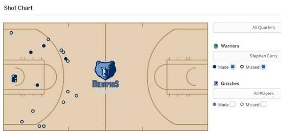 在这68场比赛里,除了那31场命中率0%,库里还有3场三分球10投1中,对手分别是湖人、黄蜂和灰熊。其中最近的一场是2014年12月16日客场挑战灰熊,库里全场25投9中,三分10投1中,交出了19分7篮板6助攻的数据,勇士最终以105-98的比分输球,终止了16连胜。