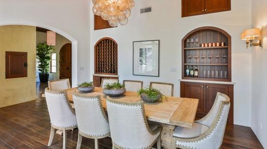 客厅很宽敞,顶部有一盏很酷的吊打,而且还有一个巨大的火炉。饭厅里面则由许多藏酒。