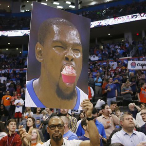 “杯子蛋糕”已经成为了凯文-杜兰特返乡战的一个主题,全场许多雷霆球迷都穿着杯子蛋糕T恤或者拿着杯子蛋糕形状的纸牌,以讽刺杜兰特软弱。
