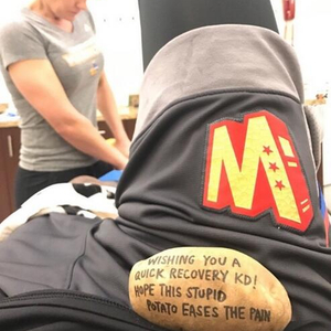 照片中,杜兰特正躺在理疗床上接受治疗,他立起一条腿,在自己的小腹上放着那个土豆。土豆上还写着一段话:“祝你能快速康复,KD!希望这个愚蠢的土豆能缓解疼痛。”