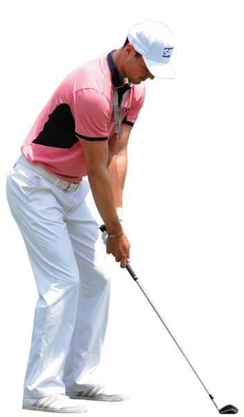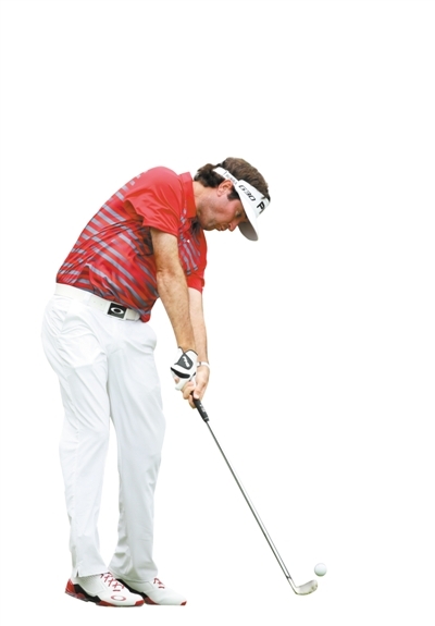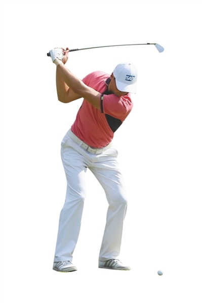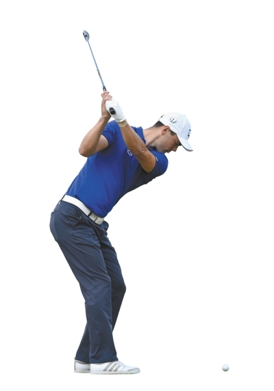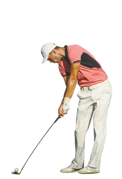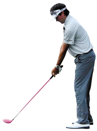 身体轴心:把双髋想象成一个平面,身体轴心就像一根棍子从头顶穿过这个平面的中心点,身体轴心和该平面垂直。在整个挥杆过程中必须维持身体轴心和双髋平面的垂直关系。