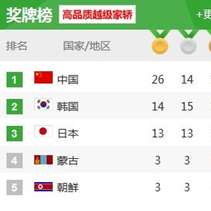 北京时间9月22日,仁川亚运会今天夺金项目的争夺全部结束,中国代表团以26金14银18铜的战绩排名奖牌榜第一,韩国14金15银16铜,日本13金13银16铜。>>>>点击观看详细奖牌榜