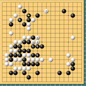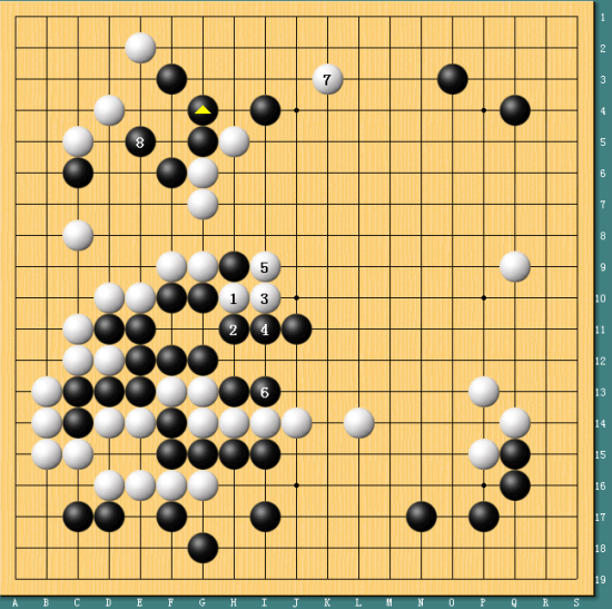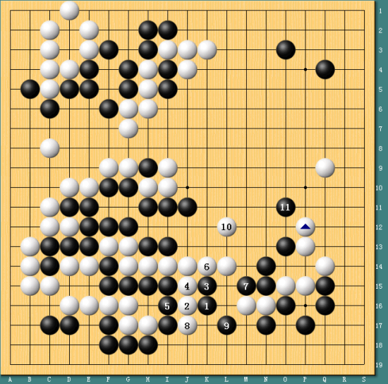 图二,逆转前奏。实战中陈耀烨在左上角轻松走成先手活,黑棋得以在下边11位率先动手,冲击白棋的薄弱环节。陈耀烨已经逐渐扭转了序盘的不利。