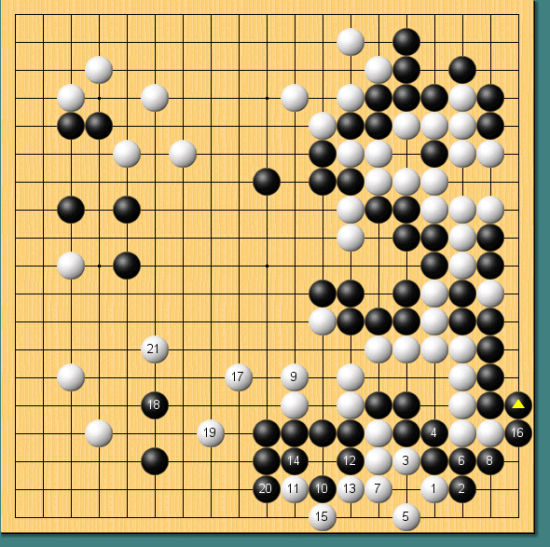 图一,古力执黑VS柯洁。右下角白1托时,黑棋在左边扳原本是局部正手。实在古力为了不给白棋一只先手眼,却选择冒险的2位扳,白3-7的下法并不复杂,最后的结果是黑棋花了16、20两手棋,下边还仅仅留个打劫杀,此时白龙已经不好攻。