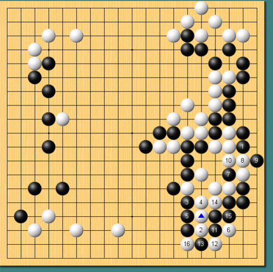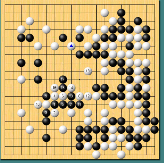 图三,周睿羊执黑VS芈昱廷。中盘时,周睿羊欲强攻右下白龙,白三角位靠时黑棋竟然脱先在右边1位爬。白2穿下后黑棋根本没拿出什么像样的进攻,白16断吃时白棋已经宣告安全。