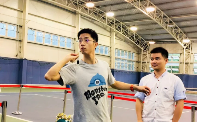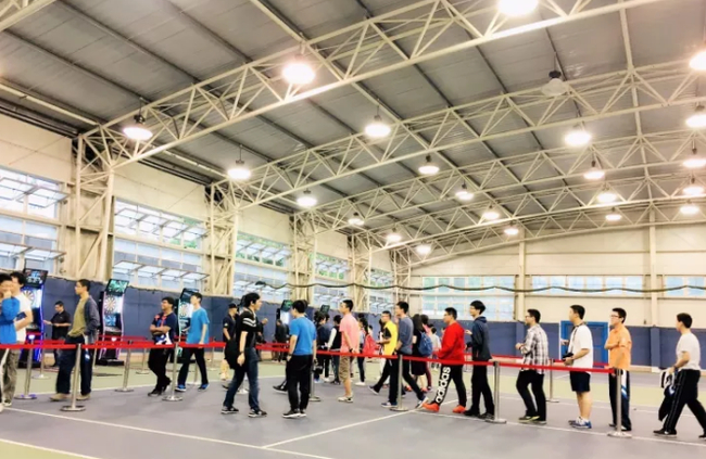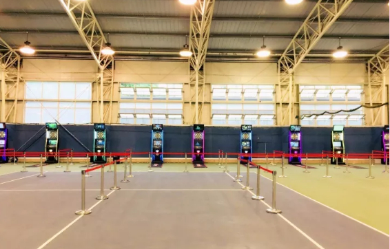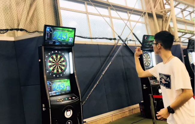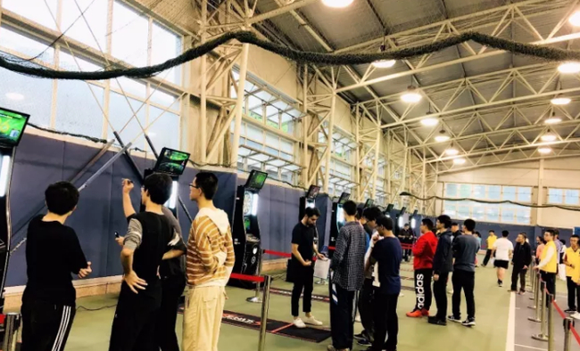 来到网球中心,站在门口朝里看去,宽广的体育场馆整齐的摆放着10台凤凰互联网飞镖机,每台飞镖机两边闪烁着靓丽的灯带,随着音乐不断变换着各种色彩,与此刻师生的激动心情相呼应。