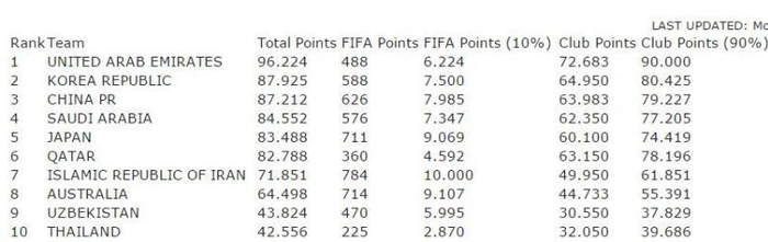 亚足联技术分由两部分组成,其中俱乐部参与洲际赛事的表现在技术分中占比90%,国家队的FIFA排名换算成的积分占比10%,总积分的排名将会直接和亚冠名额挂钩。