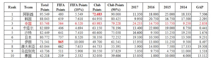 2017年的亚足联技术分将直接决定2019和2020年的亚冠参赛名额,在最新的技术分榜上,中国以87.212分排在亚洲第三位,东亚第二位,暂时落后排在东亚第一位的韩国0.713分,差距不大。