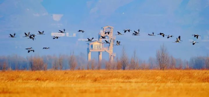 在奔跑中与冰雪、湿地融为一体:海坨戴雪与灰鹤豆雁齐飞,冰封湖面与芦苇共长天一色,人在画中行,在奔跑中入画。