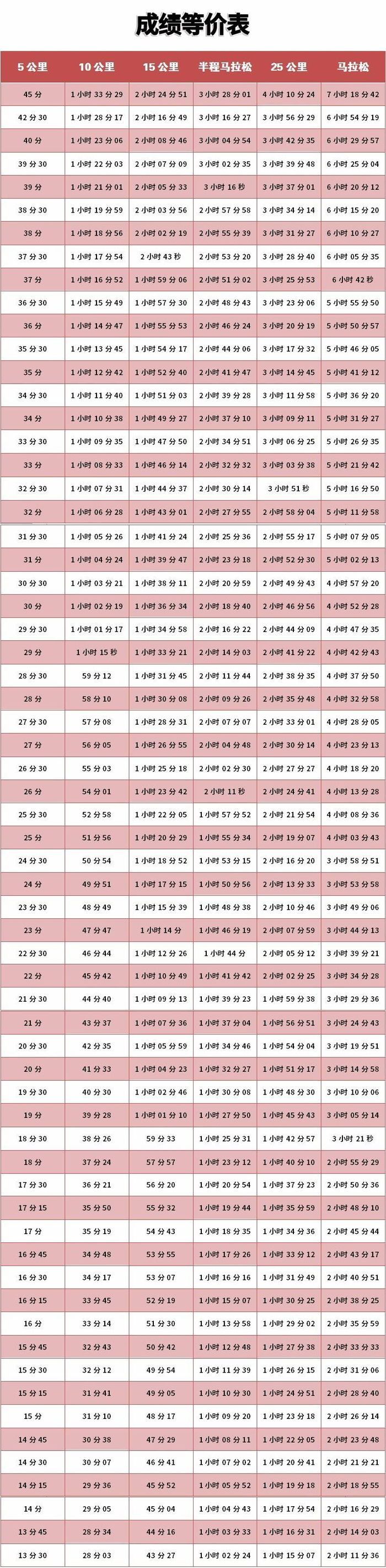 注:成绩等价表并不是配速表。距离越长,配速上越有衰减。