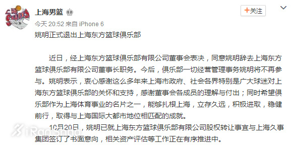 姚明退出上海男篮管理层,并跻身胡润中国富豪榜 | 刚刚辞去上海男篮董事长职务的现任篮协主席姚明以22亿的身家进入了最新的胡润中国富豪榜。早前,上海哔哩哔哩篮球俱乐部通过微博官方宣布:前董事长、现任中国篮协主席姚明正式退出上海男篮管理层,他的股份将转让给上海久事集团。