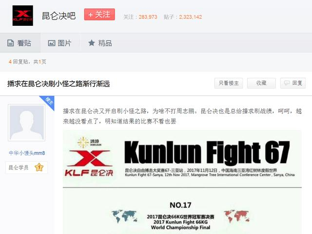 我相信冯杰的实力,但至少要让他先打一年自由搏击比赛,适应期之后再战播求,那个时候他甚至有可能成为第一个KO播求的中国拳手。此外,就连昆仑决贴吧的粉丝也已经不满播求了,认为他不敢打周志鹏是懦夫行为。