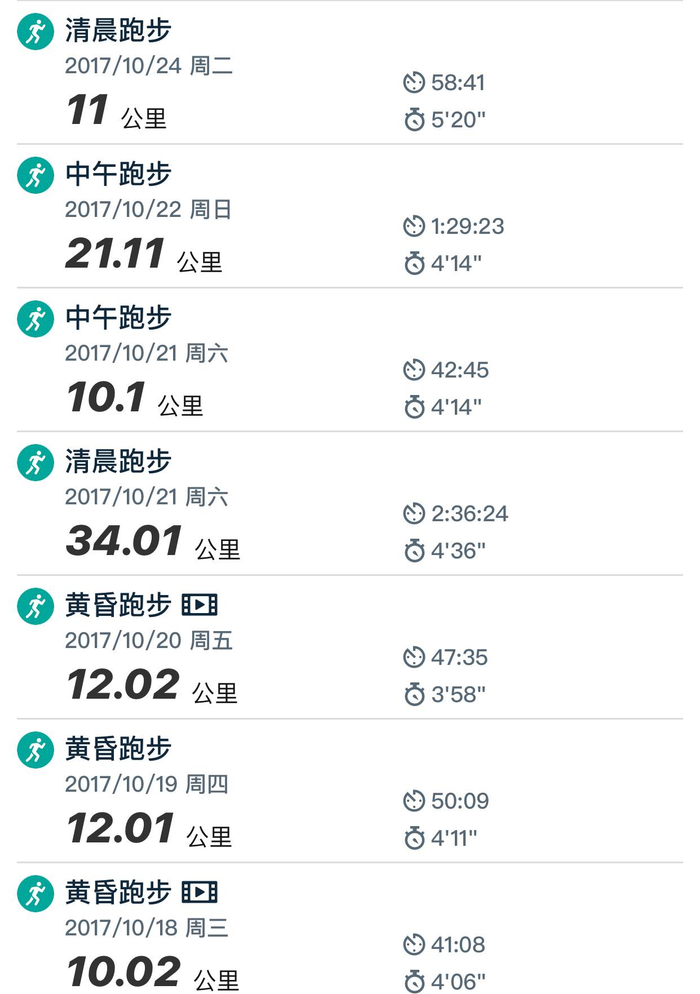 因为周三的跑量较大,周四我只在下午跑了12公里,配速4分11。10月20日,我的跑步提升强度,下午以3分58秒的配速完成12公里跑,为周末的长距离做铺垫。