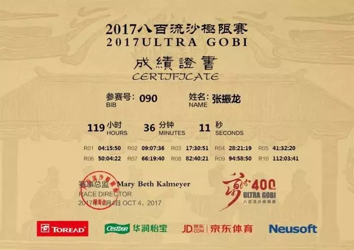 而前不久,我刚刚挑战了八百里流沙,获得第十六名,而这次参赛的目的就是挑战极限、挑战未知、挑战自我,虽然成绩对我来说不理想,但是能顺利完成我已经很高兴了。