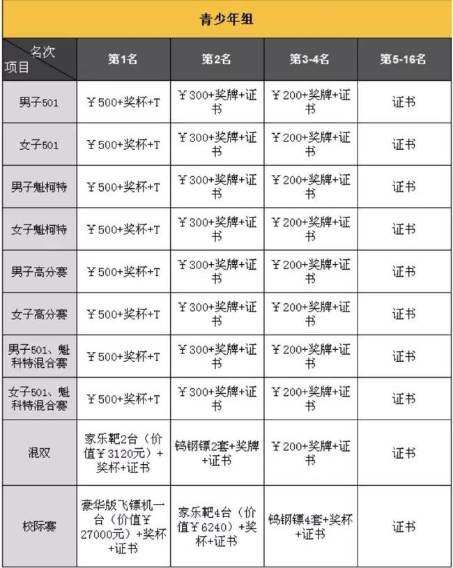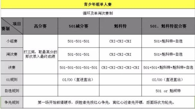 女子:高分赛、501减分赛、魁科特、701+魁科特;