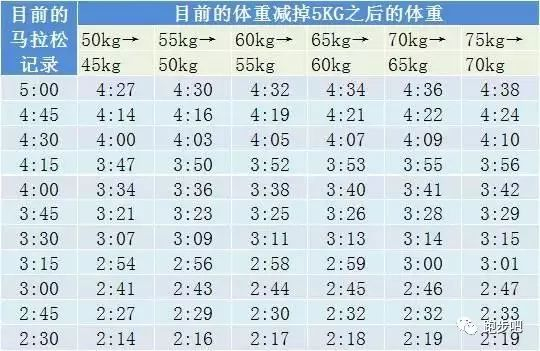 从表格来看,如果你现在全马纪录是4个小时,体重是70kg,如果减重到65kg的话,全马时间可以一举快到3小时41分!