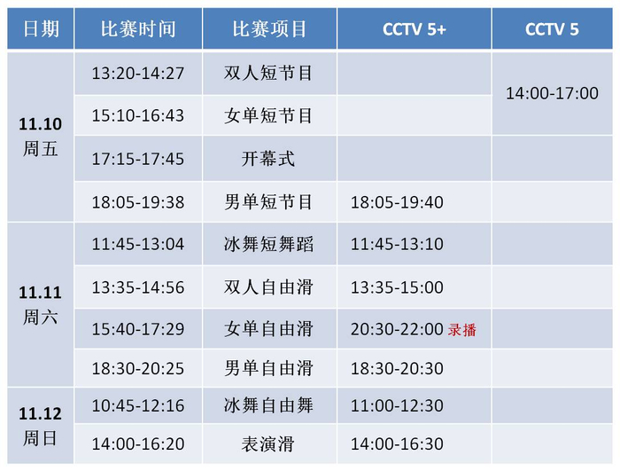 11月10日2:00-3:30中国杯女单短节目、自由滑