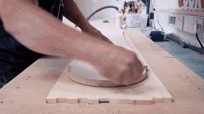 将板芯、板面和板底组合并铺叠在一起,随后放入压制机床中进行长时间高温压制,这时我们的滑板雏形就基本完成了。