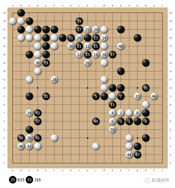 黑31后,白32立即打入,随后连续向中腹跳出,崔精决赛中表现得很扎实。