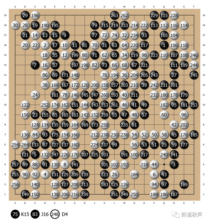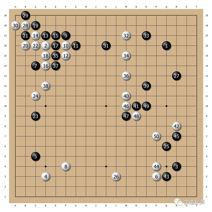 左上角的双飞燕定式,白16靠是AlphaGo的下法,到白24左边告一段落,感觉黑棋没有不满。
