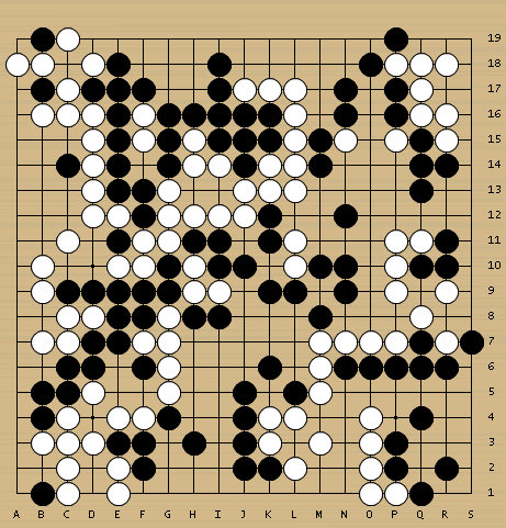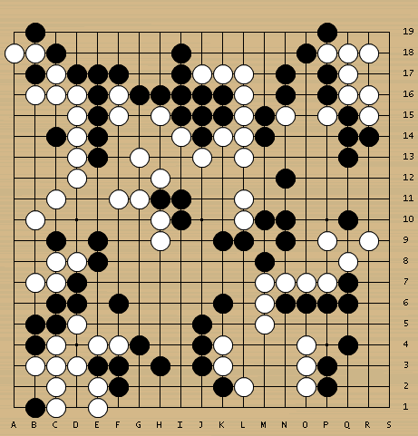 星星依然简明应对,让白棋活角,到黑19割下白棋两子,黑棋全局实地领先。